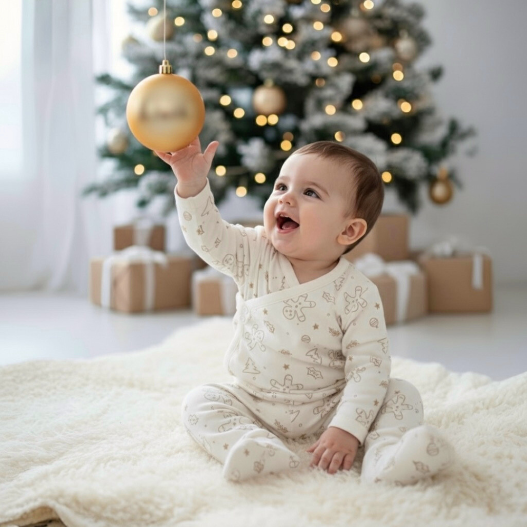 La chaqueta para bebé Ginger Cookies está confeccionada en 100% algodón orgánico certificado GOTS, con un interior suave y un acabado respirable que cuida la piel sensible en temporada navideña.